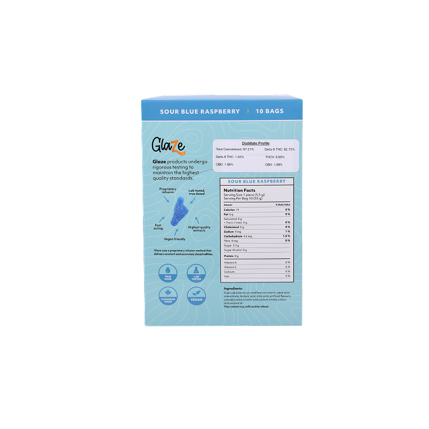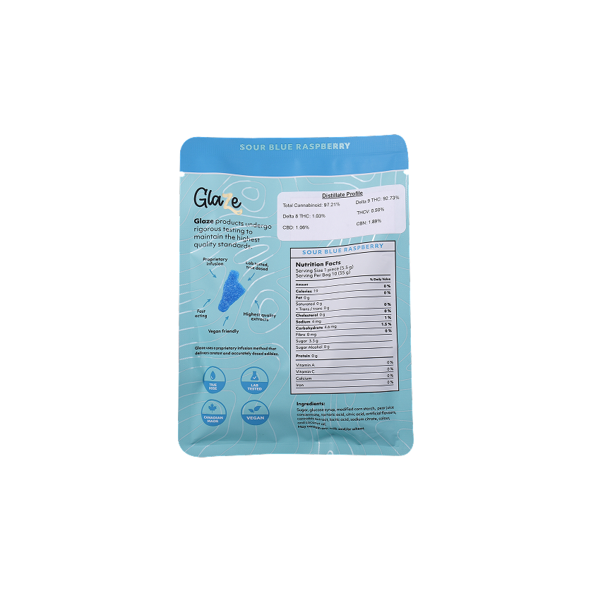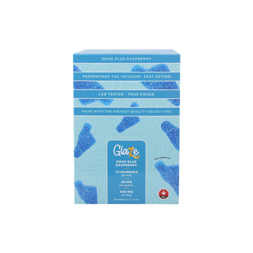 Indulge in the tangy sweetness and potency of Blue Raspberry Big Feet Box by Glaze. Each box contains ten bags, meticulously dosed at 400mg each, offering a flavorful and potent cannabis experience.